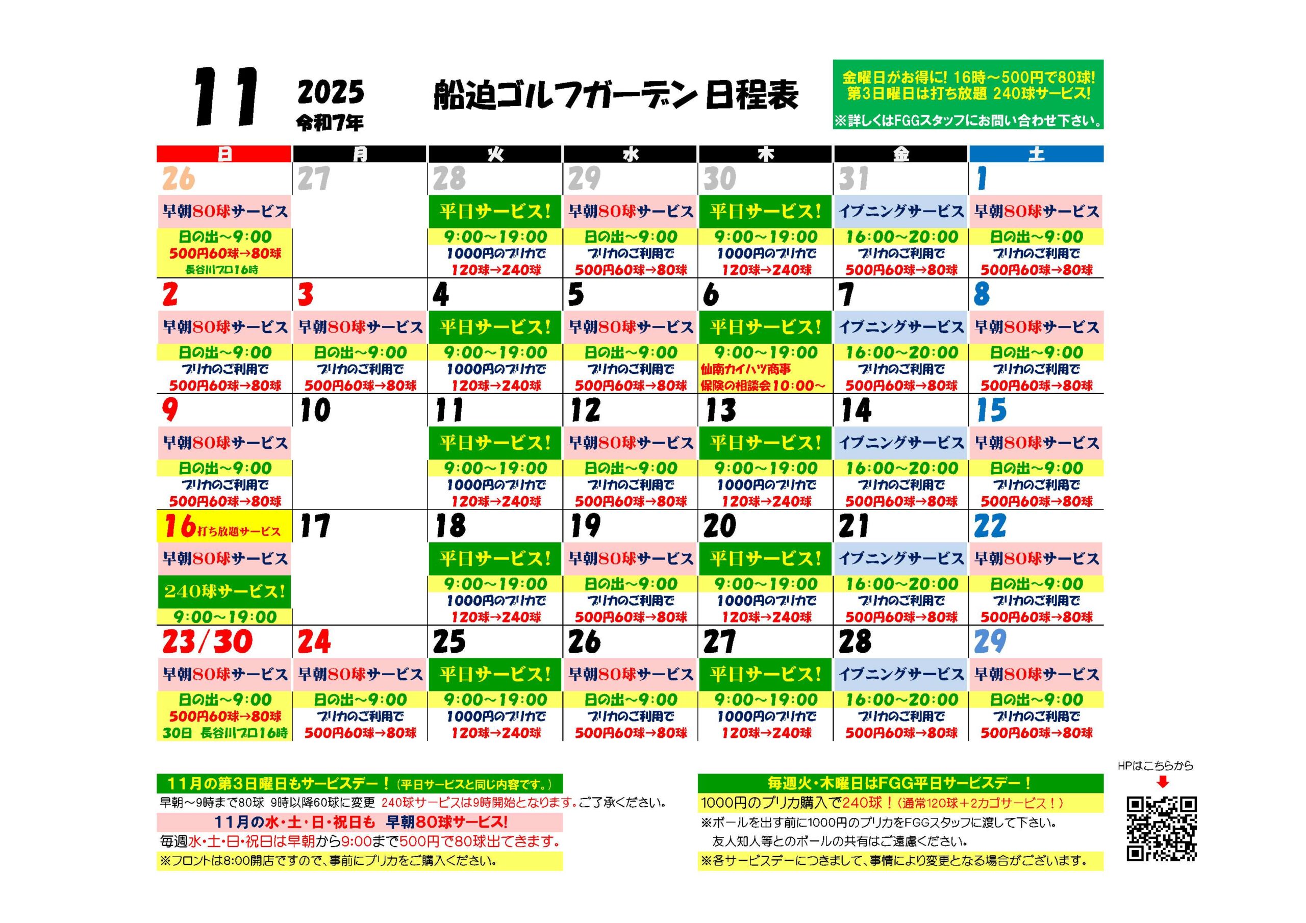 【FGG】2025年11月 営業カレンダーについて 船迫ゴルフガーデン