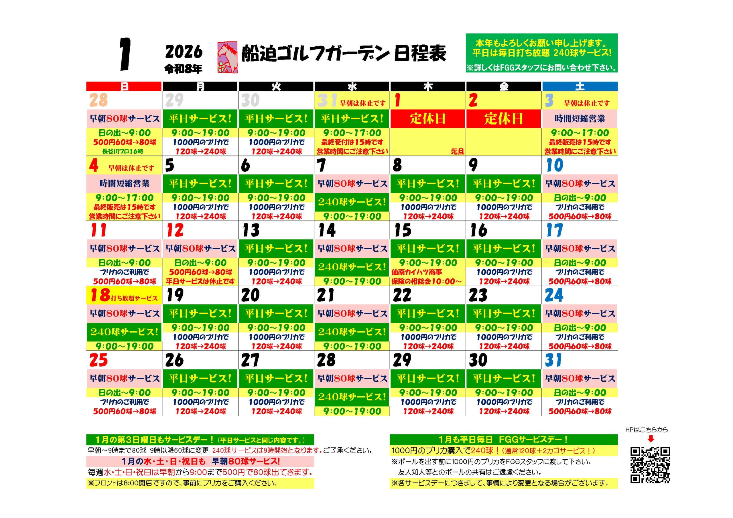 【FGG】2026年1月 営業カレンダーについて 船迫ゴルフガーデン