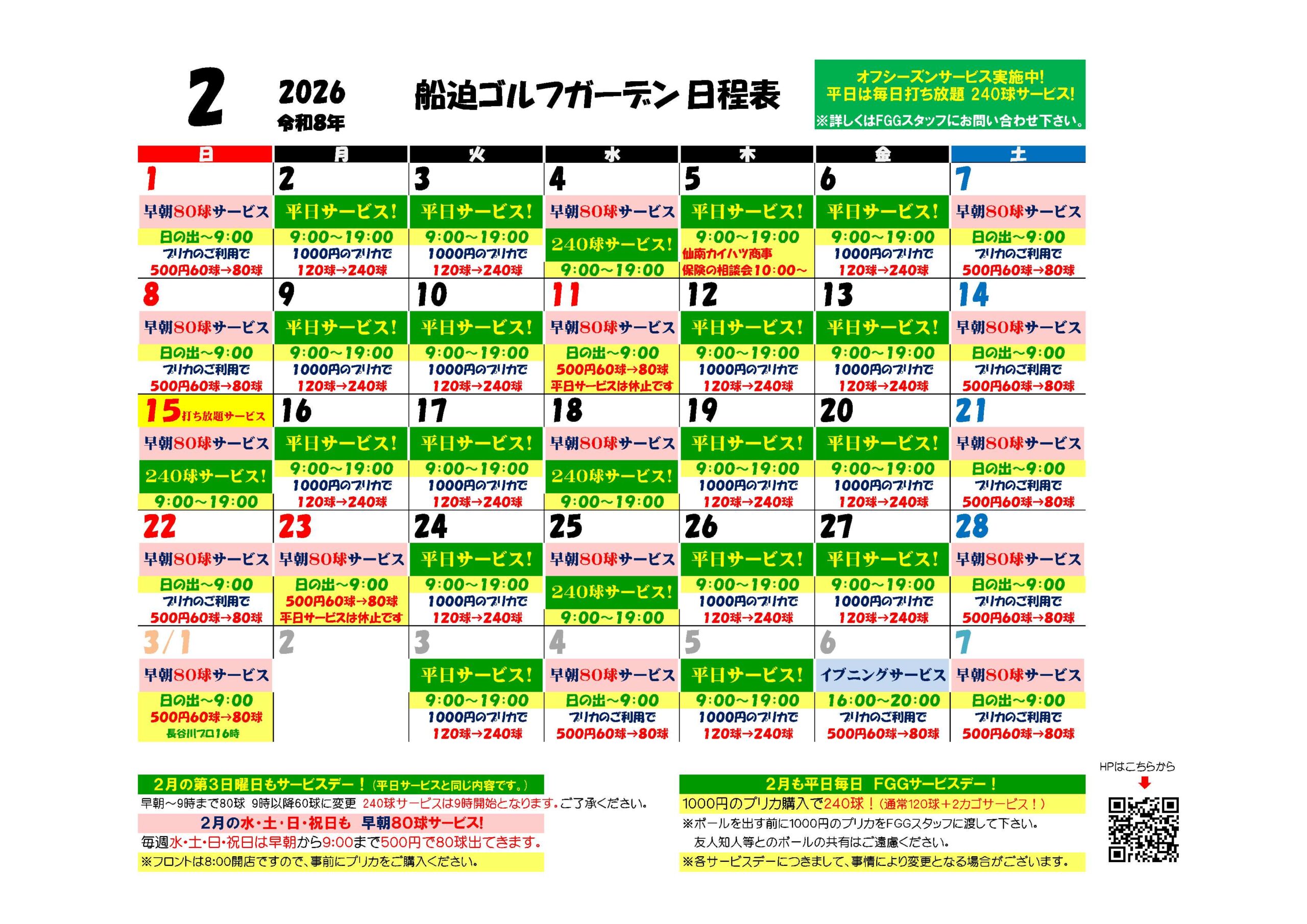 【FGG】2026年2月 営業カレンダーについて 船迫ゴルフガーデン